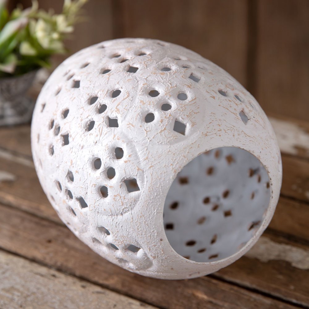 This perforated decorative egg is designed with lightweight metal with a rustic white coating. It can be set on a tabletop by itself or looks nice with lights inside. This decorative egg also makes a nice Easter decoration. Lights are not included.