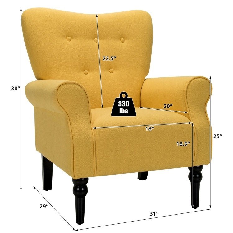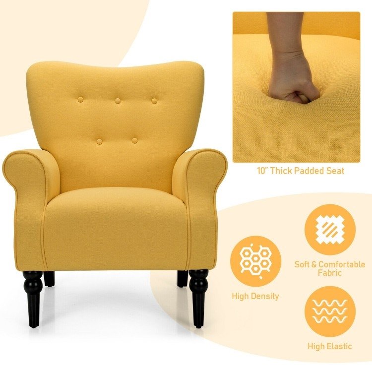 Sit back and relax in style with this Retro Tufted Polyester Accent Chair w/ Espresso Rubber Wood Frame - Yellow. Crafted with premium polyester fiber and high-density sponge, this modern chair is breathable, skin-friendly and wear-resistant. The accent chair allows you to sit with utmost comfort. This accent chair can well support your back, hand, waist, hip and legs. Apart from that, ergonomic backrest and armrests can perfectly fit your body curve, which is beneficial to your spine health. Its spacious seat can also offer you sufficient activity space. The accent chair is equipped with 4 espresso rubber wood legs to withstand the test of time.