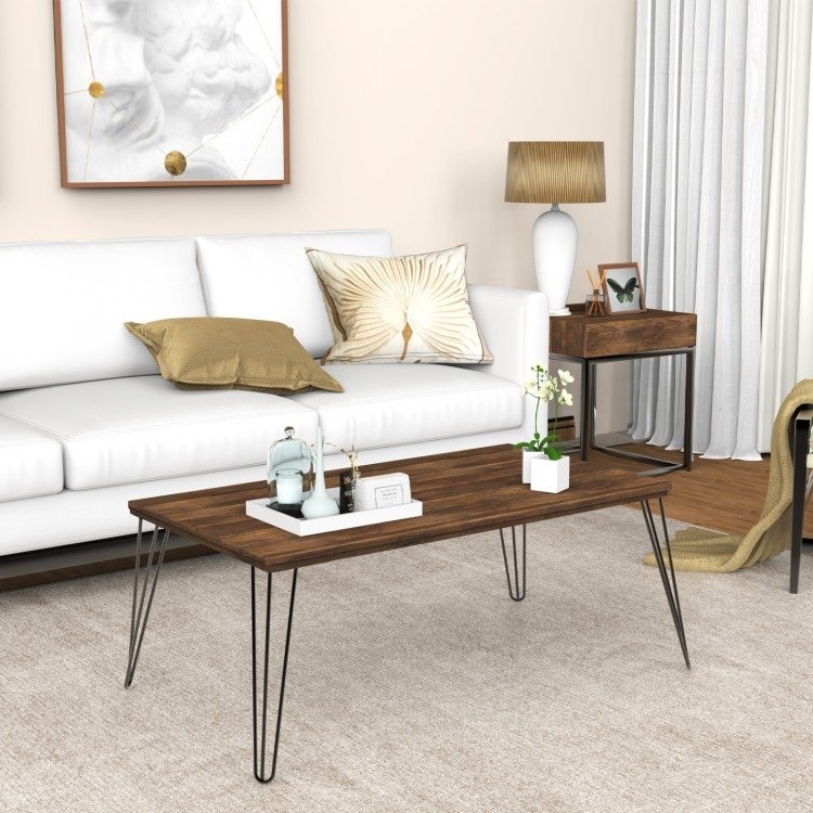 This Rustic FarmHouse Wooden Coffee Table with Modern Metal Legs is a perfect addition to any living room! The surface of this coffee table is made of high-quality wood painted with harmless spray paint. Rugged and durable metal legs give a strong support to whole table.