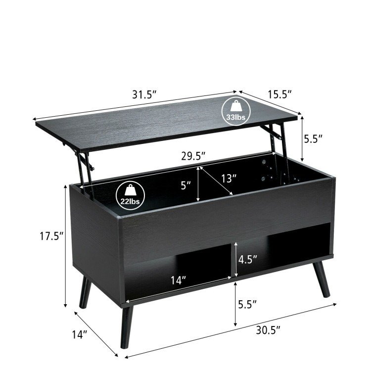 This sturdy multi purpose Mid-Century Lift-Top Coffee Table Sofa Laptop Desk in Black Wood Finish is equipped with a built-in metal lifting mechanism. If you raised the top, it would raise up automatically to save your energy. The whole lifting process of the desktop is smooth and silent without wobbling and there are several crash pads on table frame to avoid damage. This coffee table comes with 3 large storage sections, offering enough storage space. 2 storage shelves in the bottom of the coffee table allow you to put items on it for convenient access.