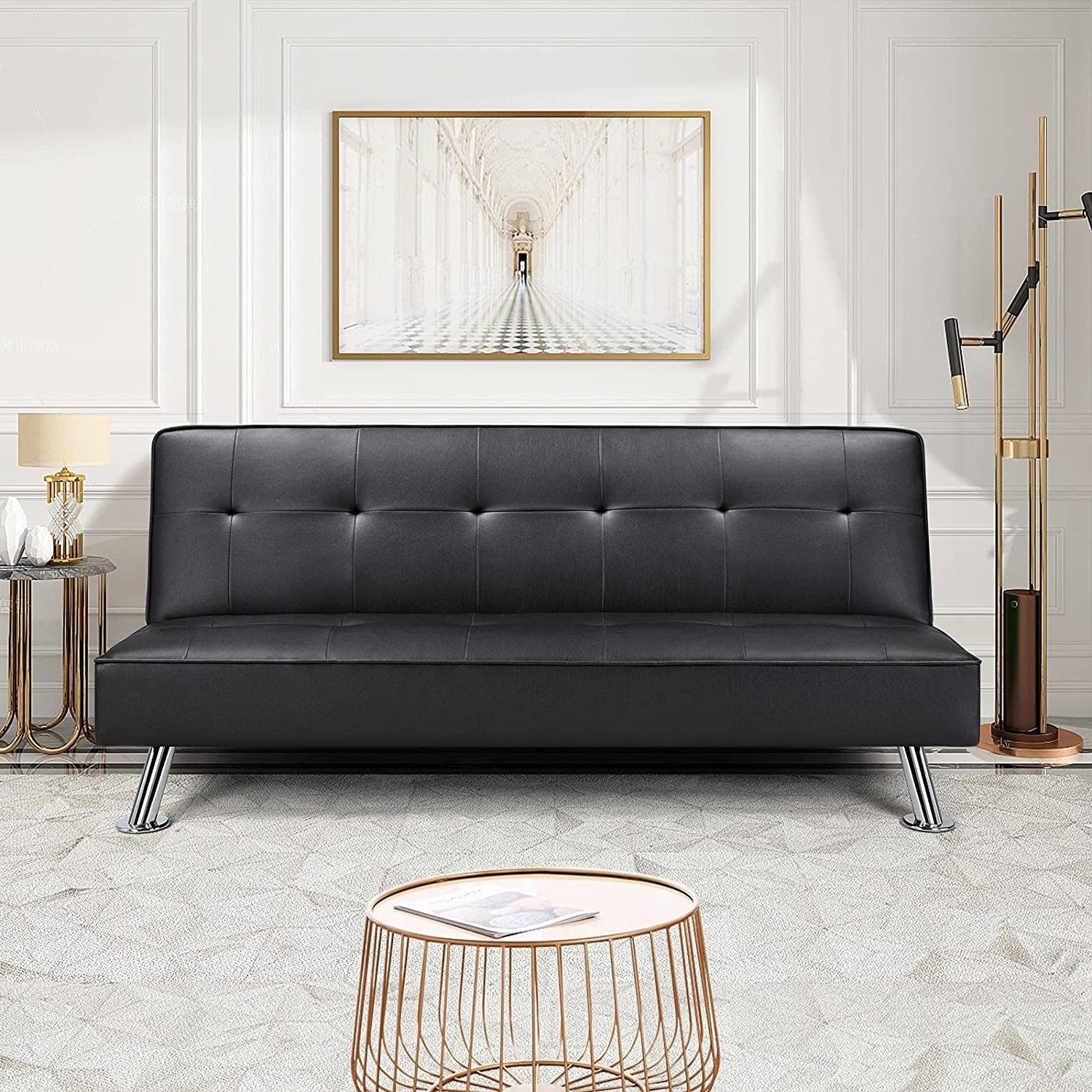 This Black Faux Leather Click Clack Adjustable Futon Sleeper Sofa provides functional and aesthetic furniture for any limited space. Crafted from a plywood frame, faux leather covering, foam fill, and strong metal spring, this convertible sofa bed features a flexible folding contraption to lock the back at 2 tilt angles for reading and lounging or lay it down as a comfy platform bed. With the solid construction, it can easily hold up to 770lb. The tufted faux leather upholstery presents an understated yet luxurious touch.