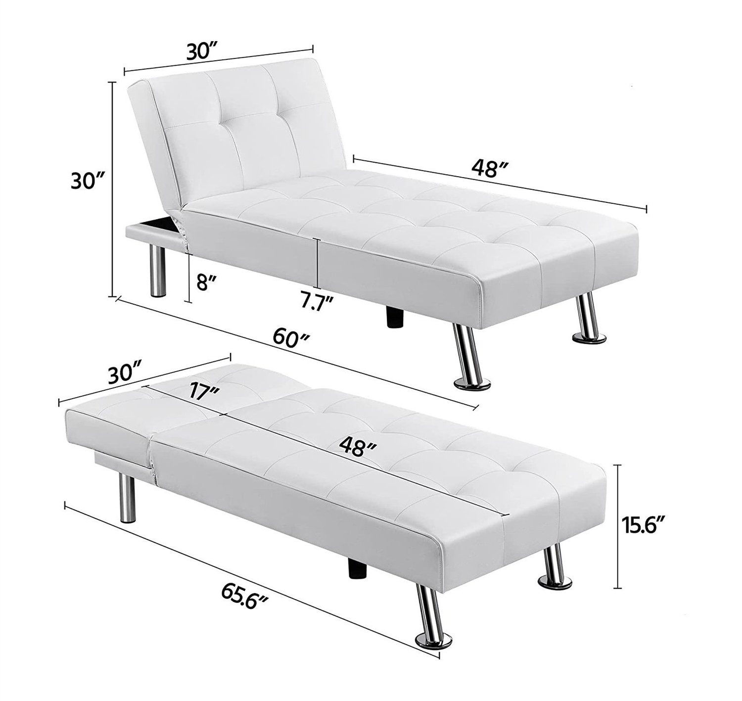 Sit back and relax in style and comfort with this White Modern Faux Leather Chaise Lounge Sleeper Sofa. Classic faux leather upholstery features the design for a luxurious modern appeal, while tufted details give a touch of texture to the chaise lounger. Pairs well other convertible sofas. This chaise lounger has a folding contraption and the lounge back can be locked at 105 degrees for reading/TV or 140 degrees for lounging, and/or put down flat as a 65.6 inches L x 30 inches W platform bed for sleeping. This sturdy convertible chaise lounger sofa is crafted with a plywood frame, faux leather covering, foam fill, and strong metal spring for robust structure. The water-resistant faux leather upholstery and chromed plated legs can be cleaned with a damp cloth and mild cleanser. Hold up to 600 lbs. Assembly is a breeze, just 3 simple steps.