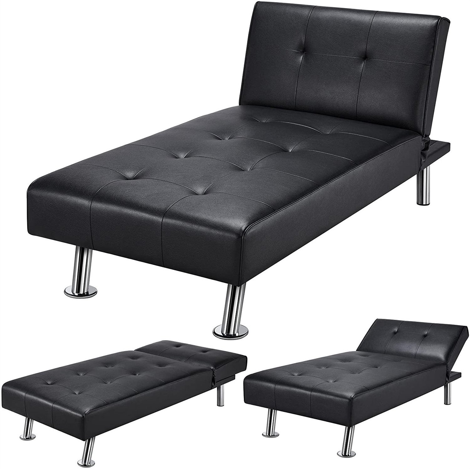 Sit back and relax in style and comfort with this Black Modern Faux Leather Chaise Lounge Sleeper Sofa. Classic faux leather upholstery features the design for a luxurious modern appeal, while tufted details give a touch of texture to the chaise lounger. Pairs well other convertible sofas. This chaise lounger has a folding contraption and the lounge back can be locked at 105 degrees for reading/TV or 140 degrees for lounging, and/or put down flat as a 65.6 inches L x 30 inches W platform bed for sleeping. This sturdy convertible chaise lounger sofa is crafted with a plywood frame, faux leather covering, foam fill, and strong metal spring for robust structure. The water-resistant faux leather upholstery and chromed plated legs can be cleaned with a damp cloth and mild cleanser. Hold up to 600 lbs. Assembly is a breeze, just 3 simple steps.