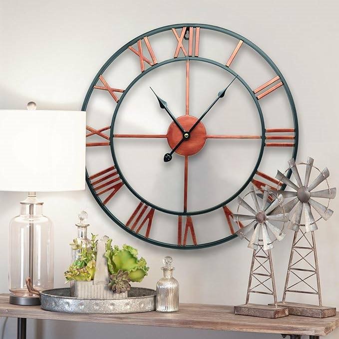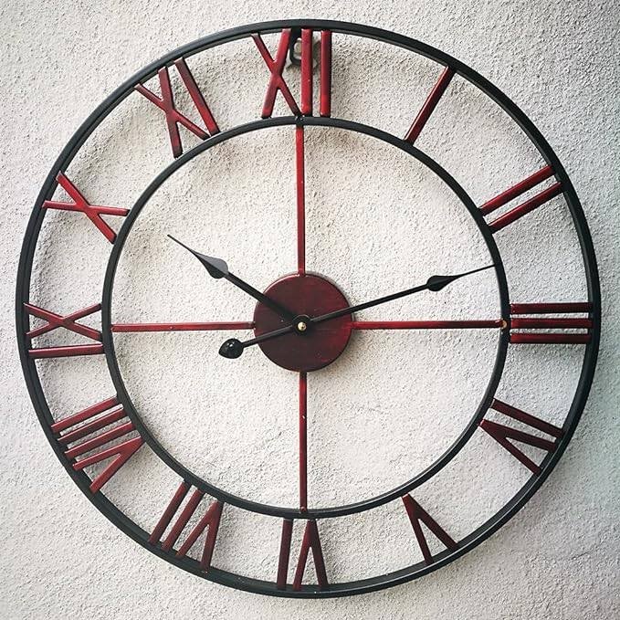 This Decorative 18.5-inch Roman Numerals Silent Non-Ticking Wall Clock in Red is an oversized iron wall clock with European retro style and no frame surface. Enjoy a vintage display on the wall with a fashion pattern available, best decoration. Diameter: 18.5”(47cm) Classic and elegant and looks great on the wall of the living room, bedroom, kitchen, hallway, office, study, cafe, hotel, restaurant etc. Handmade iron metal, classic industrial Roman Numerals, with hand painted vintage color. Famous Qualify Quartz Sweep Movement and no second design guarantees accurate time & absolutely silent environment. Recommended AA ordinary Carbon Zinc or Heavy Duty battery (NOT Included), excluding Alkaline battery.