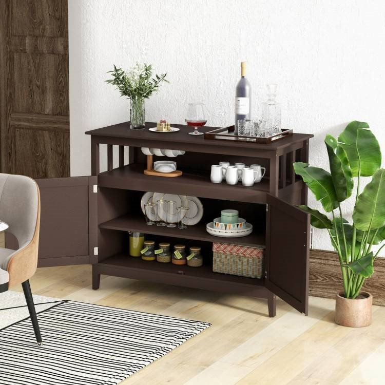 • Dark Brown Wood 2-Door Dining Buffet Sideboard Cabinet with Open Storage Shelf