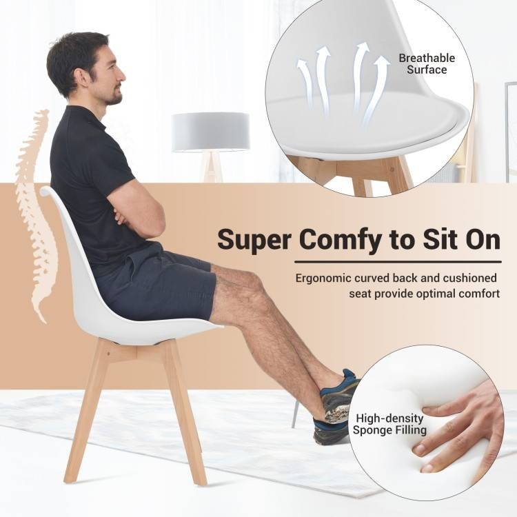 This Set of 4 Modern Mid-Century Style White PU Leather Dining Chairs with Wood Legs would be a great addition to your home. The innermost sturdy PP layer and wear resistant PU leather cover make this chair hard to crack or fade. Premium beech wood legs offer this dining chair strong impact and compression resistance, which can withstand up to 265lbs. Featured with a large seat and curved ergonomic high backrest, plus high resilience and thick foam provides you with hip relaxation and a comfortable sitting experience. This padded chair fits your lumbar spine and reduces back pressure. The foot pads effectively protect your floor from scratching and reduce noise while moving. Solid wood legs and cross structure at the bottom of the seat provides extra stable."S" human body engineering design perfectly fits your back and offers comfort. These 4 chairs are ideal for family gatherings and friend get-togethers. It can be used in the dining room, guest room, living room, study and lounge. Besides, a streamlined shape makes this armless chair elegant and brings the fashion-forward vibes home. With all hardware and carefully indicated instruction, the seating assortment requires minimal assembly, so you get to enjoy your new pieces within minutes of arrival. Since the smooth and waterproof PU surface, the chair is easy to clean with a damp towel. So you can effectively reduce regular maintenance work.