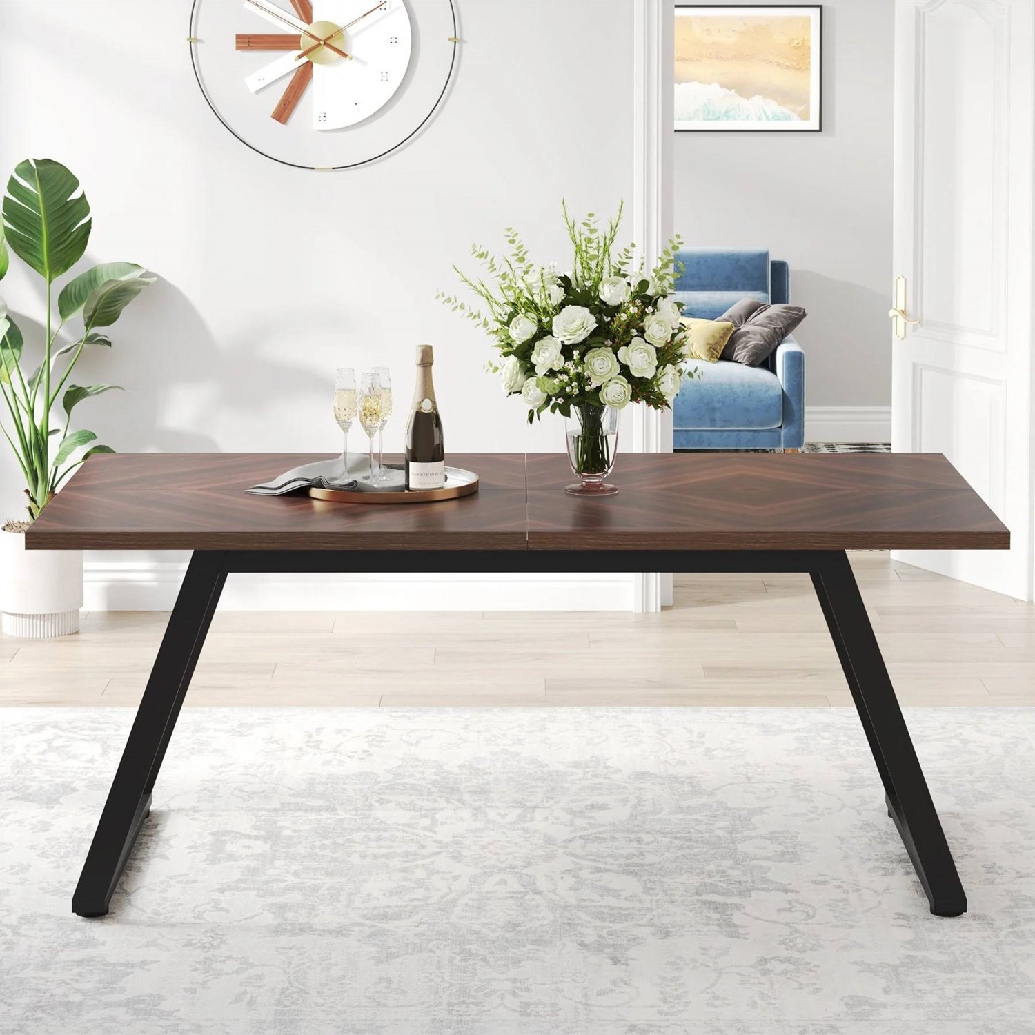 This Modern Farmhouse 63-inch Rectangle Dining Table Brown Wood Top Black Metal Frame in vintage is perfect for pairing with traditional, modern farmhouse, or country cottage aesthetics. Features a 1.18'' high-quality MDF tabletop and stable 2.36'' x 0.79'' metal steel legs structure, making it anti-scratch, stain-resistant, and water-resistant. The safe water-based paint polished surface gives it natural and smooth lines. (Size:31.5"D x 62.99" W x 28.74" H), A table full of character and plenty of room for family and friends. The compact tabletop can easily accommodate 4-6 people comfortably, it is suitable for small family dinners. Or the Perfect piece for your backyard patio. The height of the dining table is 29.92”, allowing you to stretch your feet easily while eating without feeling cramped. This kitchen table is a decent size for 4-6 people. This rectangular dining table is a great option for small Apartments. It provides enough space for meals and drinks, and the table is also lightweight and easy to move around.