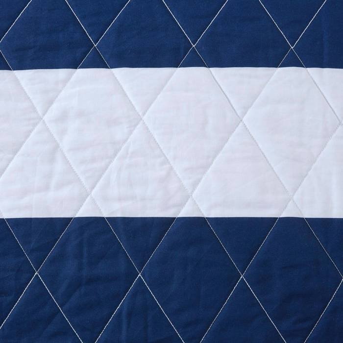 This Twin Size 2 Piece Coastal Reversible Navy/White Sharks Cotton Quilt Set adds a bright, playful accent to any bedroom with its colorful two-tone navy/white stripe pattern on one side and a bold print on the reverse. It includes a quilt with a noticeable diamond weave along with two coordinating shams (one for the twin coverlet option). Each item is made from a breathable cotton fabric that arrives pre-shrunk and is good for all seasons. This set is non-pilling, so it stands up to frequent use and multiple trips through the washing machine.