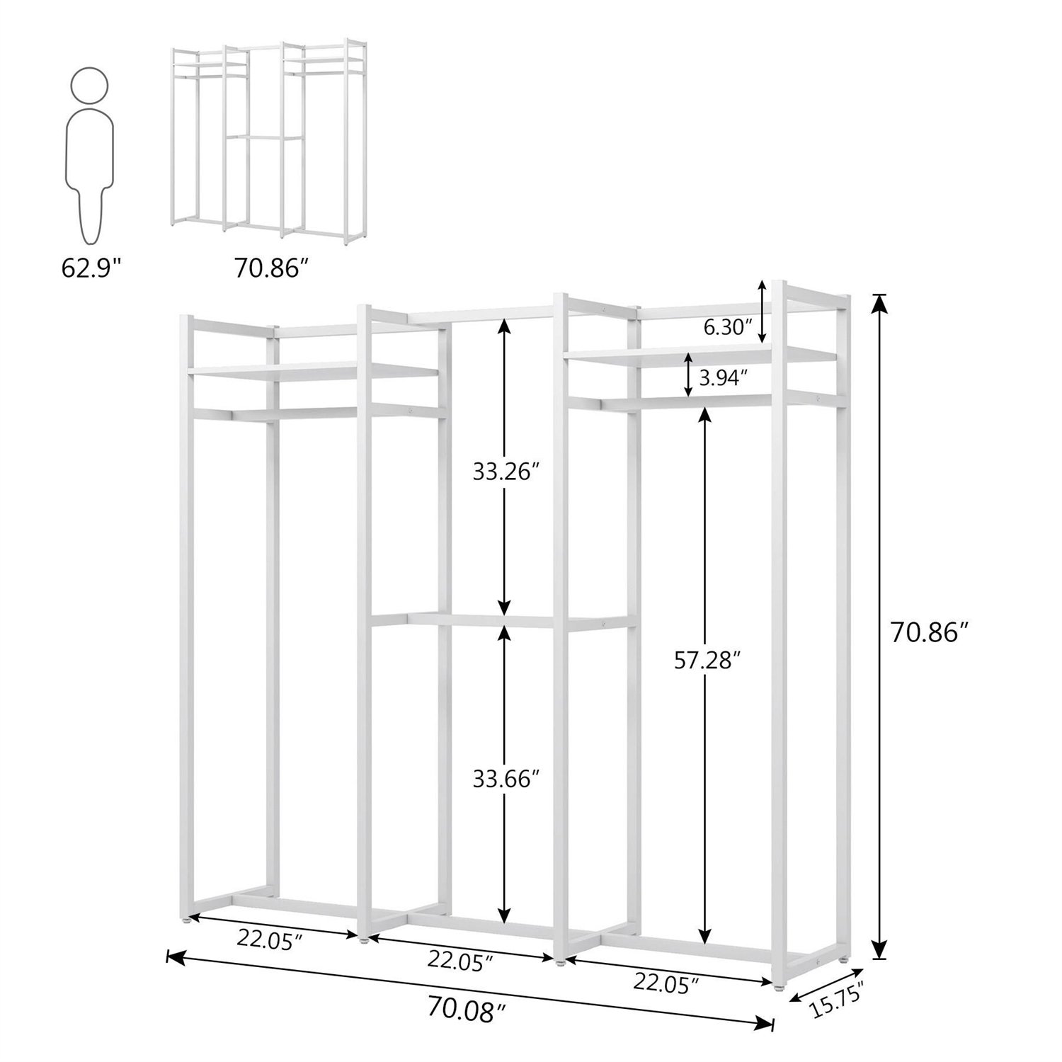 This Heavy Duty White Metal Freestanding Garment Rack with 4 Clothes Hanging Rods is perfect for clothes and shoes in cramped closets. Making small spaces more functional. The simple and chic design adds instant storage to any room. Easily transport your freestanding wardrobe. Sturdy and Durable- Heavy-duty metal frame combined with a rustic thick particle board makes it super stable and sturdy, with no wobble and collapse. Easy access to the bedroom, cloakroom, clothing store, laundry room, walk-in closet, and more. Large Storage Solution- 4 hanging rods accommodate both long and short garments. Every garment rod holds up to 50 lb. 2 open shelves ensuring you plenty of room to place clothes. And put large boxes of off-season clothes on the top for added storage.