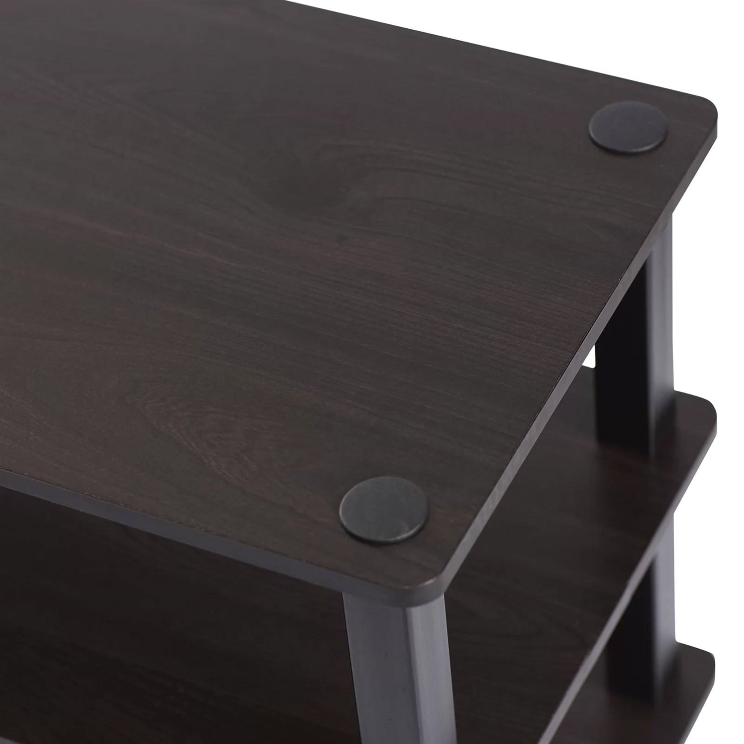 If your entryway isn't exactly organized, this Modern 3-Shelf Espresso Black Shoe Rack - Holds up to 18 Pair of Shoes can spruce things up in a second! Crafted from manufactured wood and PVC tubes, features a neutral solid finish that works in any setting. Three openwork tiers let you tuck away shoes, or add in baskets to keep out-the-door accessories easily corralled. Some assembly is required for this product. Consider a larger option if you’re looking to store large shoes (Men’s Size 13 or over).
