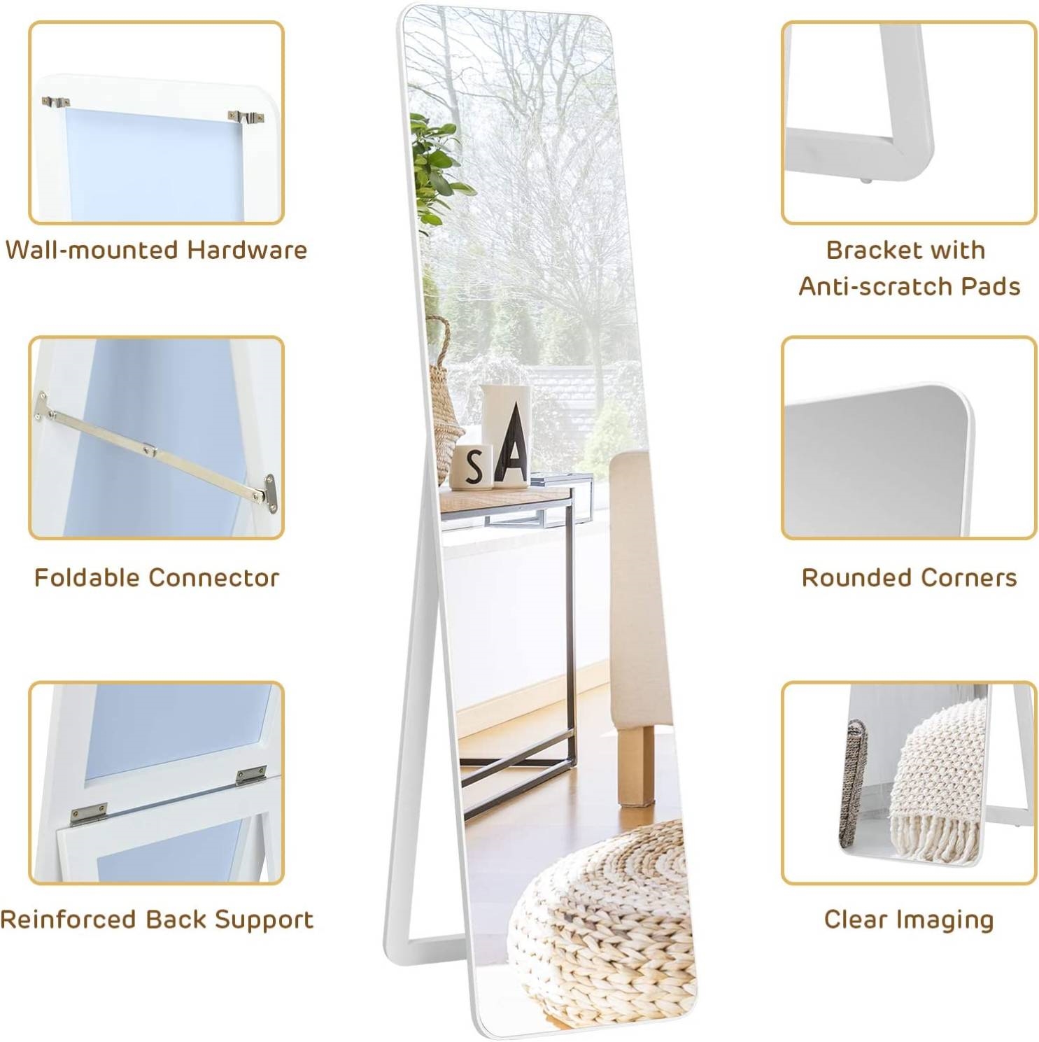 • Featuring a sturdy solid wood frame, this full-length mirror has a long service life and is not easy to deform or crack. The bracket with anti-scratch foot pads ensures a stable standing while preventing damage to the floor.