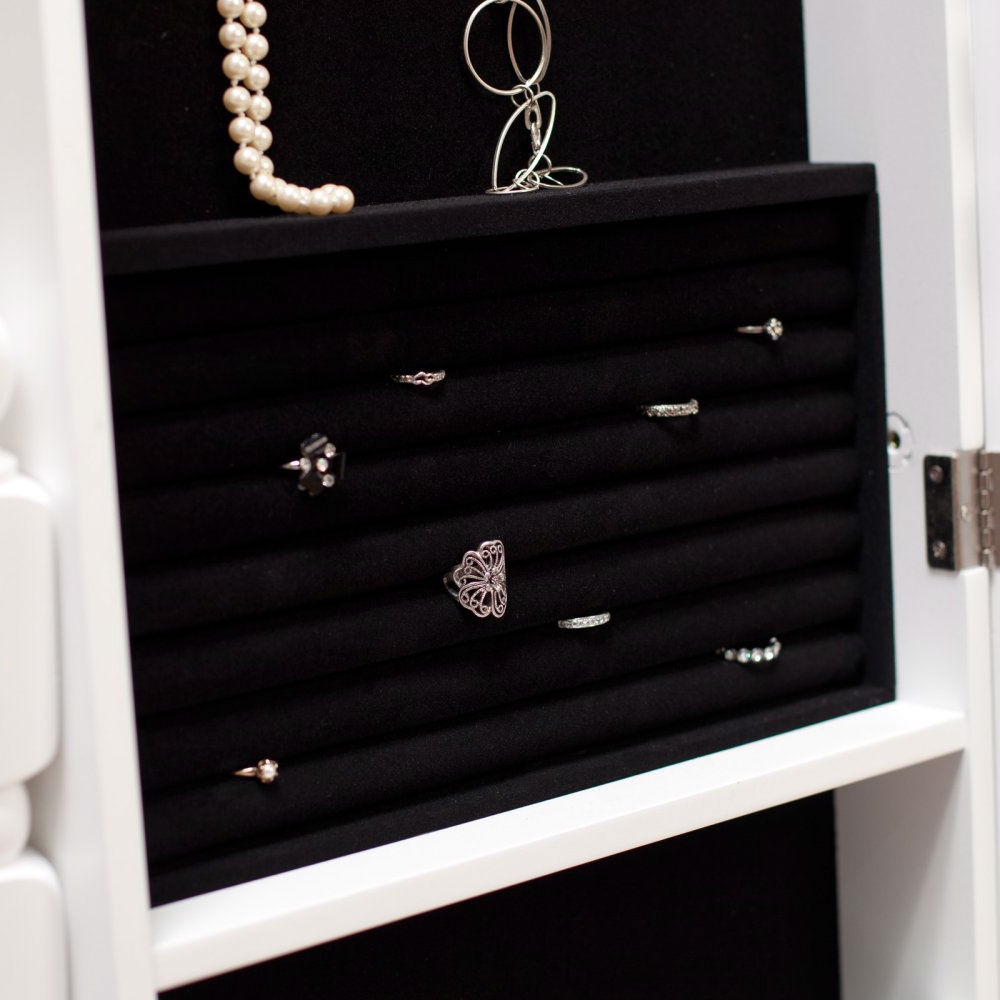This White Full Length Tilting Cheval Style Floor Mirror with Jewelry Storage is a diamond's best friend. It features a soft, lined interior with multiple compartments and other areas to keep your jewels protected and beautifully displayed. Swing open the mirrored door for easy access to your collection. Hanging hooks help prevent tangled necklaces, while ring cushions keep your rings from getting lost or damaged. Pocket shelves hold bracelets, brooches, watches, and other accessories. The adjustable full-length mirror is handy for getting ready in the morning. The mirror tilts and locks in place with a twist of a knob. The entire cabinet is constructed of medium density fiberboard (MDF) - a dense, warp-resistant engineered wood that offers lasting durability. The legs and horizontal bars are made of solid birch wood. The glossy white finish, sturdy base, and simple lines enhance the contemporary style of this freestanding jewelry armoire.