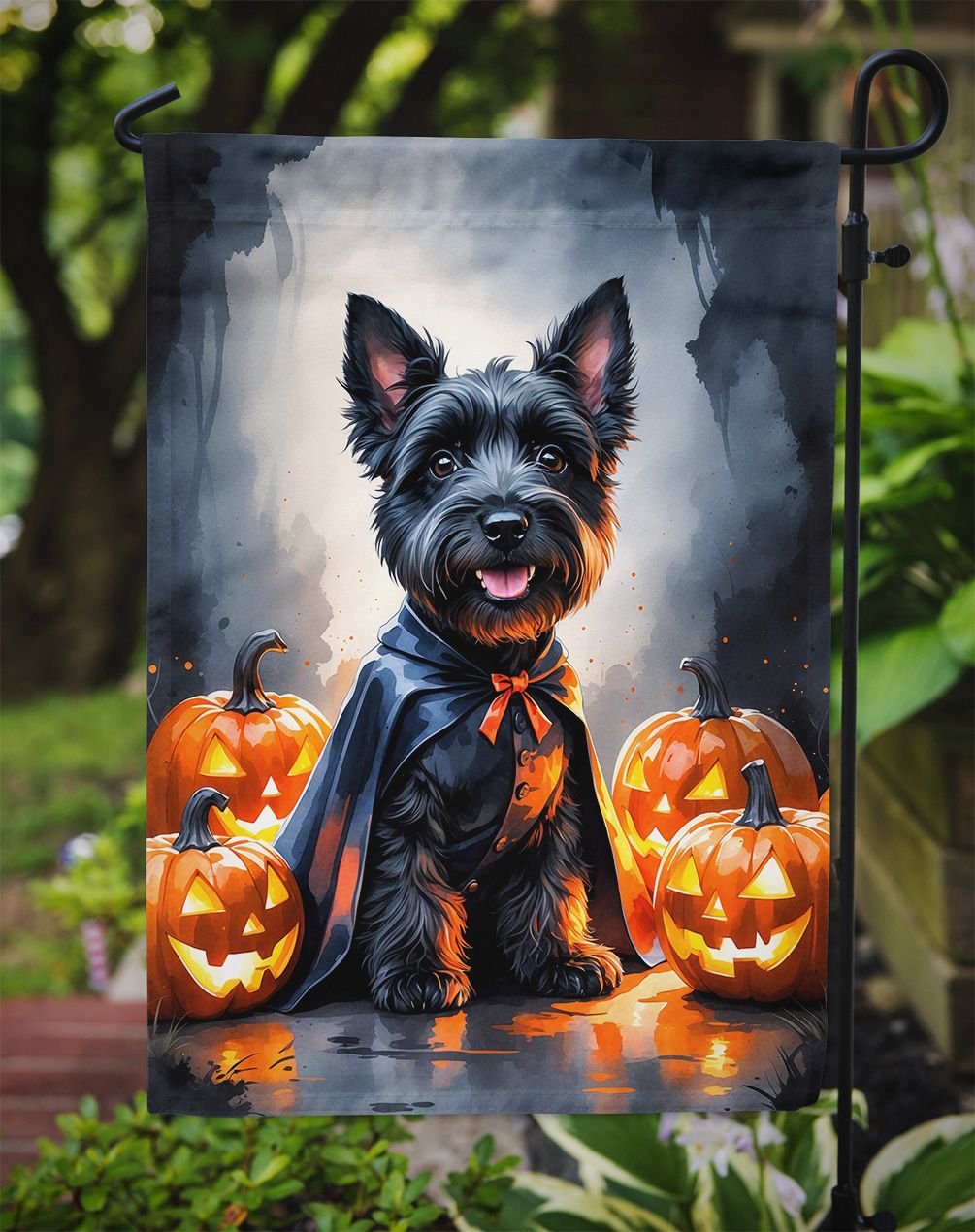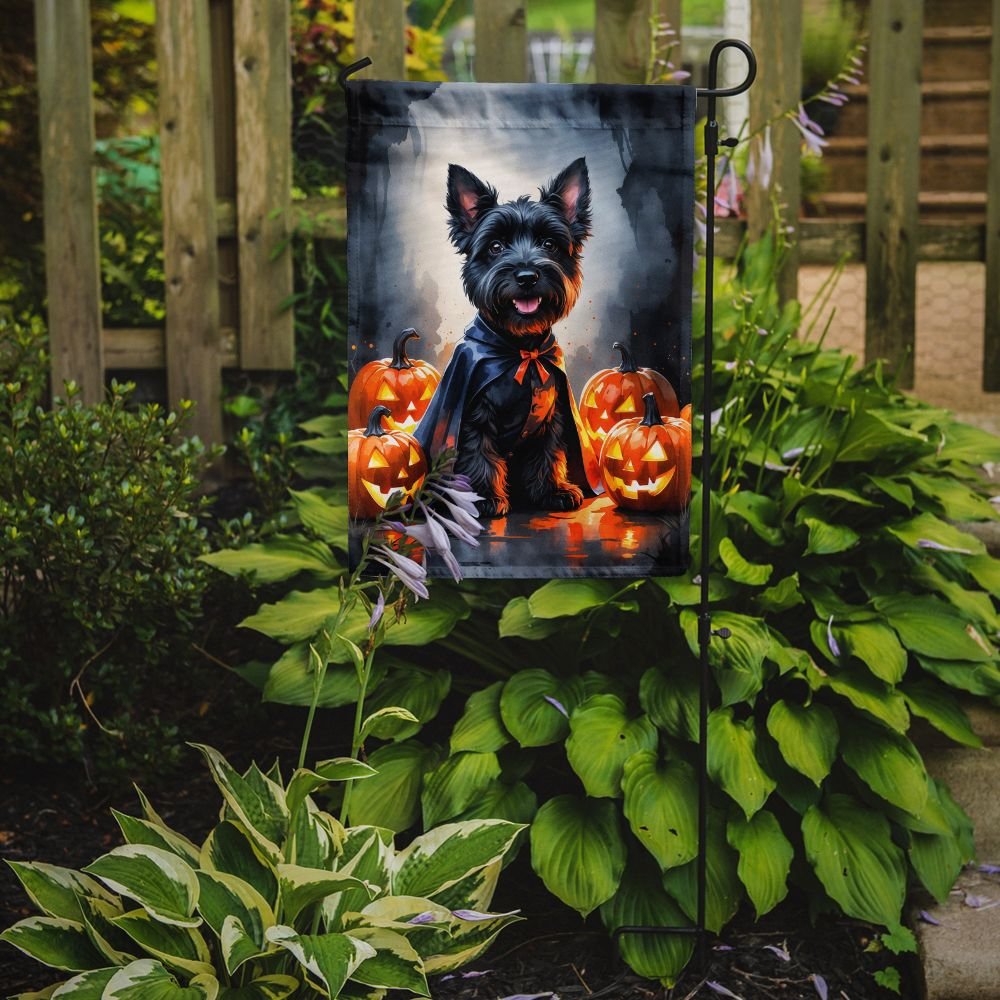 Garden Flag featuring breed specific Scottish Terrier artwork. Celebrate Halloween with this Halloween Garden Flag. Enhance the beauty of your garden, patio, or yard with Caroline's Treasures Decorative Garden Flag, proudly made in the USA. Crafted from two pieces of thick, double-sided polyester fabric, this 2-ply garden flag is designed to withstand various weather conditions, making it water-resistant and weatherproof. Featuring correctly readable words on both sides, this garden flag offers a delightful visual experience from any angle. With its heavier weight, it stands out among other garden flags, ensuring stability and durability even in wind, rain, and snow. Measuring approximately 11 1/4 inches by 15 1/2 inches, this flag allows you to personalize your outdoor decor. It comes with a 1 1/2-inch sleeve sewn in, allowing easy attachment to any standard garden flag stand or garden size porch hanger (sold separately). Make a statement in your outdoor space with Caroline's Treasures Decorative Garden Flag, a vibrant and high-quality flag that adds color and personality to your surroundings. Proudly made in the USA, it's a symbol of quality craftsmanship and attention to detail.